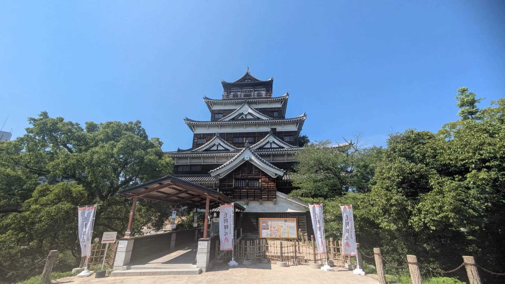 Le 6 août 1945, le château d’Hiroshima a été intégralement détruit par la bombe atomique — il se trouvait à seulement 960 mètres de l’épicentre. Tout le donjon en bois, les tourelles et les enceintes ont été soufflés par l’explosion. Le château actuel est une réplique fidèle de l’édifice original, reconstruite en 1958 en béton armé et transformée en musée. Sa structure en bois sombre et son esthétique traditionnelle tranchent avec les immeubles modernes environnants, ce qui lui donne une aura presque irréelle.