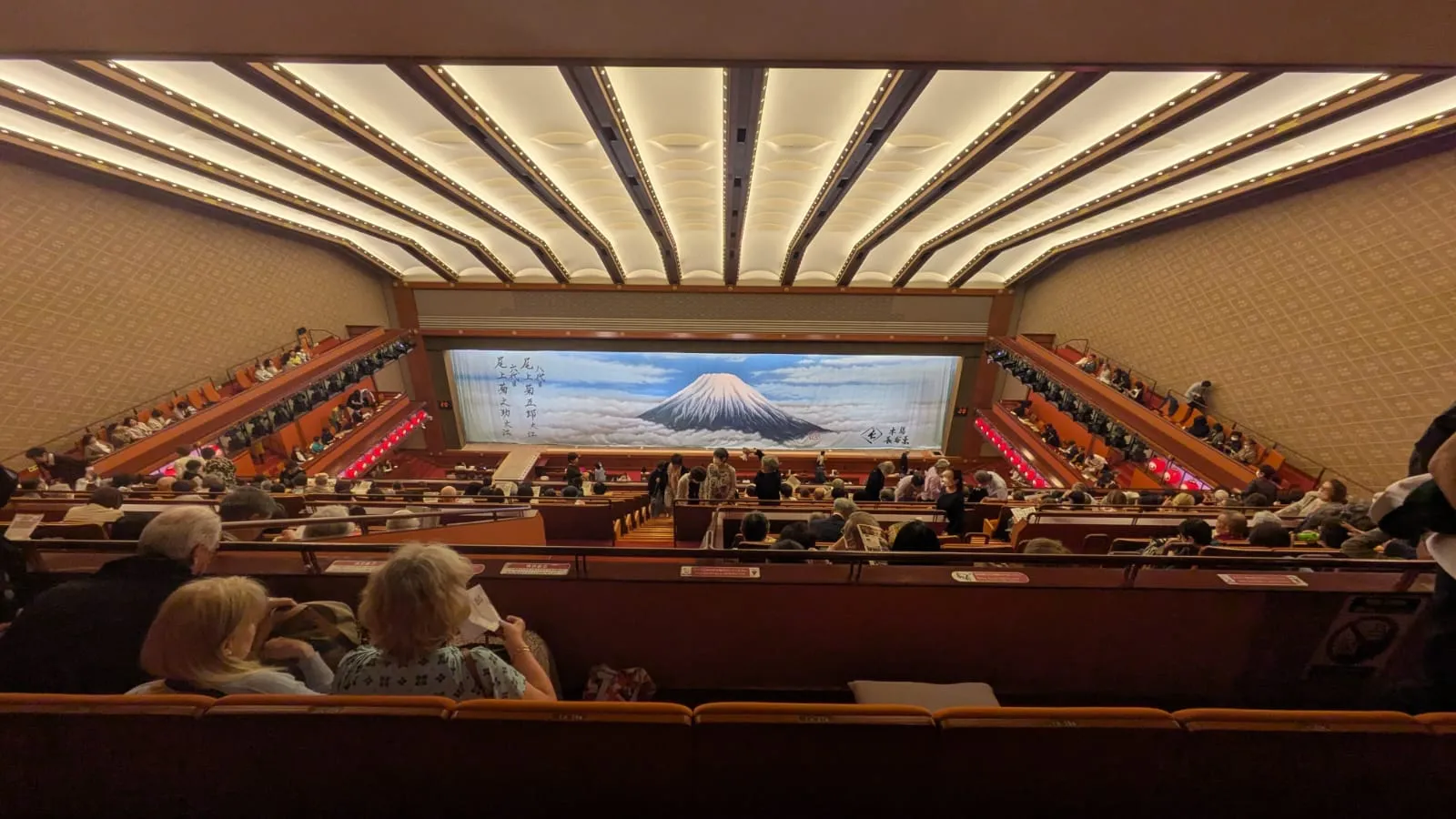 En entrant dans la salle, j’ai été frappé par le décor élégant et l’atmosphère solennelle. Le rideau arborait une magnifique illustration du mont Fuji, donnant immédiatement le ton. Les dorures, les boiseries sombres, les lanternes tamisées : tout contribue à créer une bulle hors du temps.